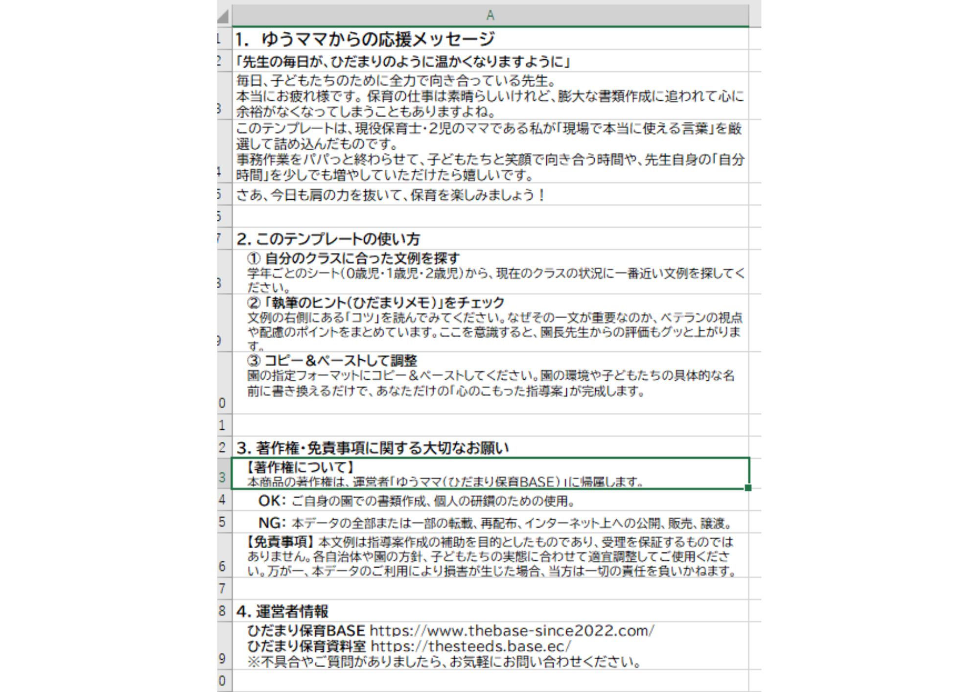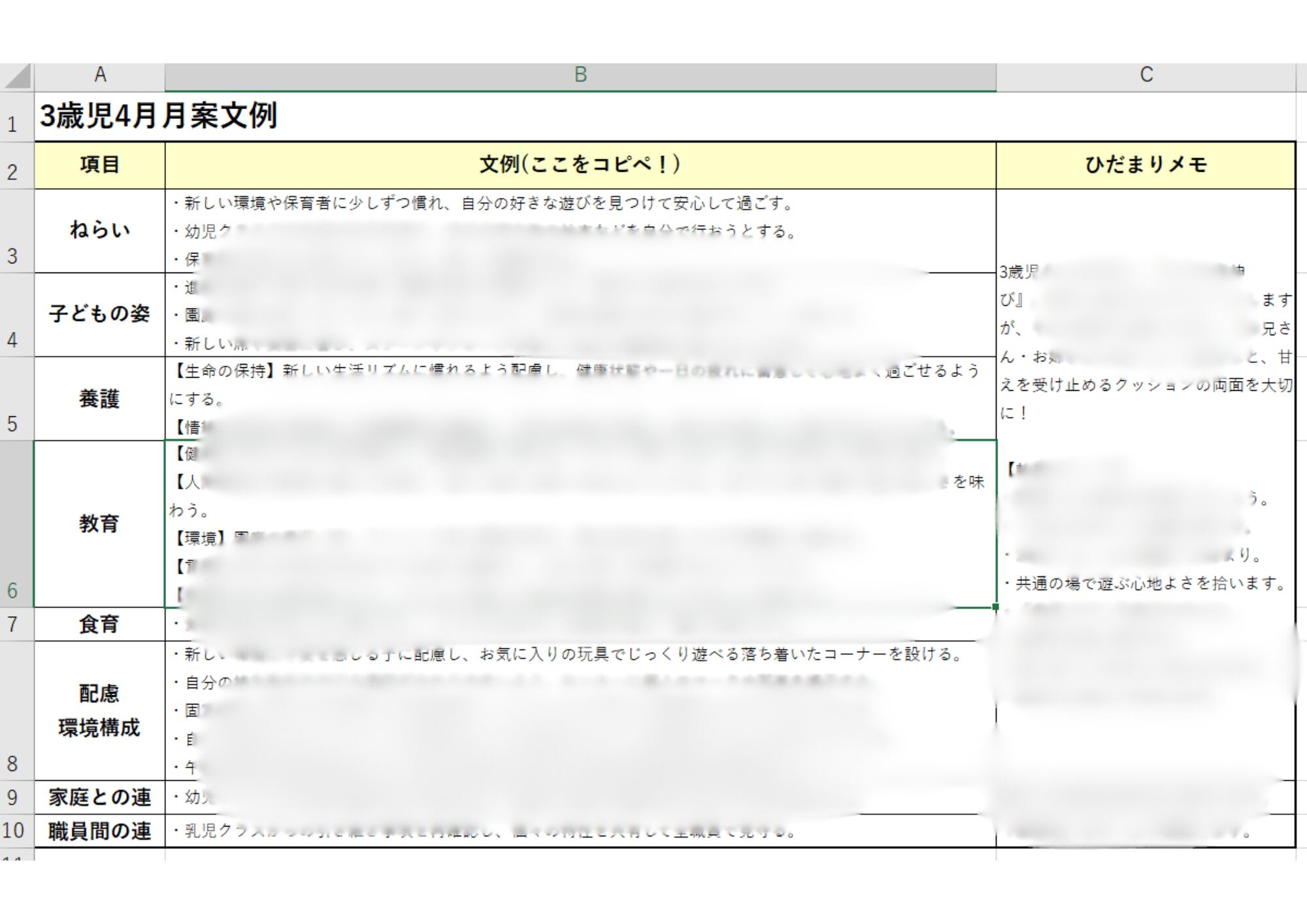 Excel(エクセル)形式で時短を実現 園指定の書式にコピー&ペーストするだけでOK。目の前の子どもたちの姿に合わせて、微調整もスムーズに行えます。